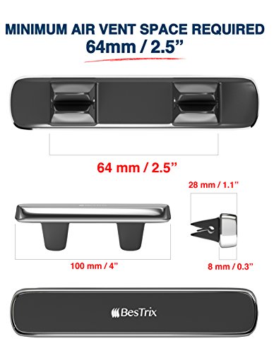 - PLEASE READ THIS BEFORE PLACING AN ORDER: The Bestrix Magnetic Air Vent phone holder’s measurements are compatible with all air vent straight blades (horizontal/vertical) over 2.5″ wide (64 mm) The product width is 100 mm. If you have a thick phone case please consider placing the metal plate on the outer side of the case (Otterbox not supported). Wireless charging is not working when using the metal plate.